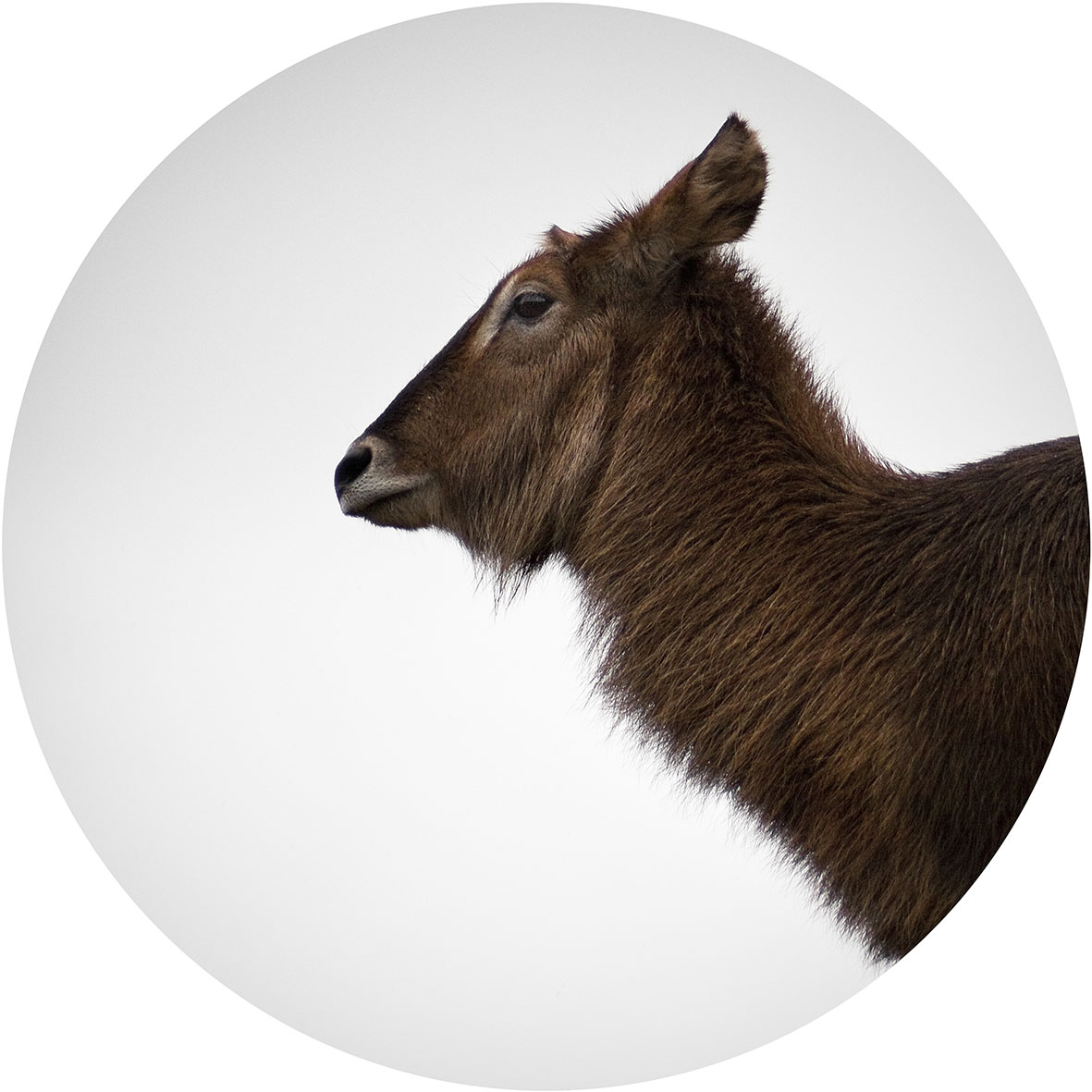 Retrato de perfil de una coba de agua o antílope acuático hembra (Kobus ellipsiprymnus). Recuerda los trofeos de caza que en ocasiones decoran algunas estancias; sin embargo, se trata de un ejemplar vivo, que se encuentra confinado en el Parque de la Naturaleza de Cabárceno en Cantabria (España). Pese a que en su actual régimen de exhibición su única función sea la de ser contemplado, el animal mantiene la misma mirada, independientemente de que el disparo sea realizado con una cámara fotográfica o con un arma. |